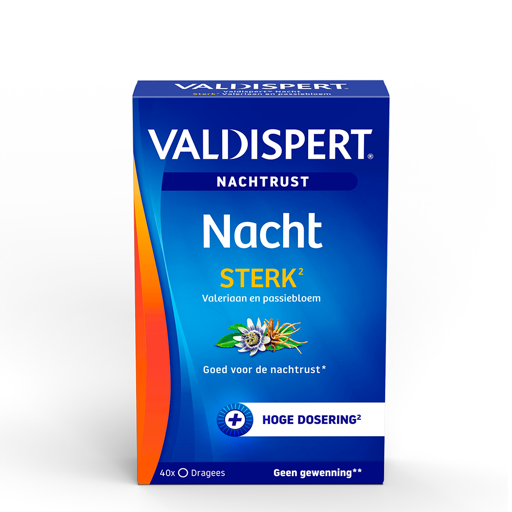 *gezondheidsclaim in afwachting van Europese toelating. **valeriaan en passiebloem helpen een gezonde nachtrust te behouden. ***Nacht Sterk Valeriaan en Passiebloem hoge dosering is gebaseerd op 500mg valeriaanwortelextract en 260mg passiebloemextract ten opzichte van 350mg valeriaanwortelextract en 200mg passiebloemextract in Valdispert Nacht.