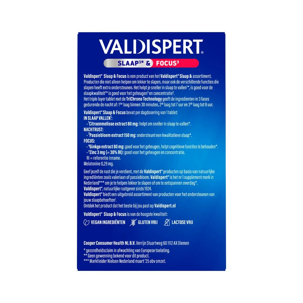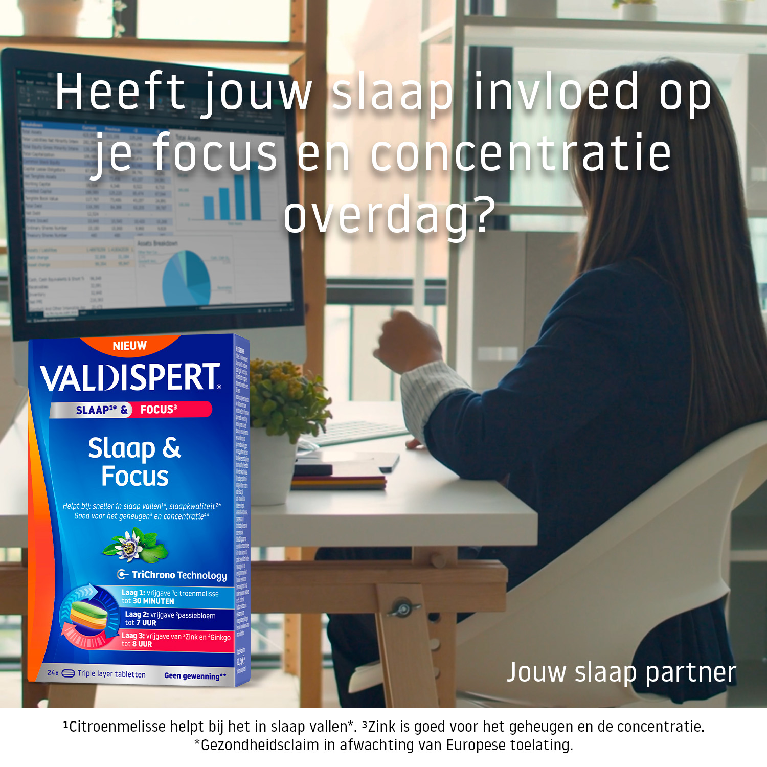 Valdispert® Slaap & Focus is een product van het Valdispert® Slaap & assortiment. Producten die niet alleen helpen om lekker te slapen, maar ook de verschillende functies die slapen heeft extra ondersteunen. Het helpt je sneller in slaap te vallen1*, is goed voor de slaapkwaliteit2* en is goed voor het geheugen3 en concentratie4 overdag.