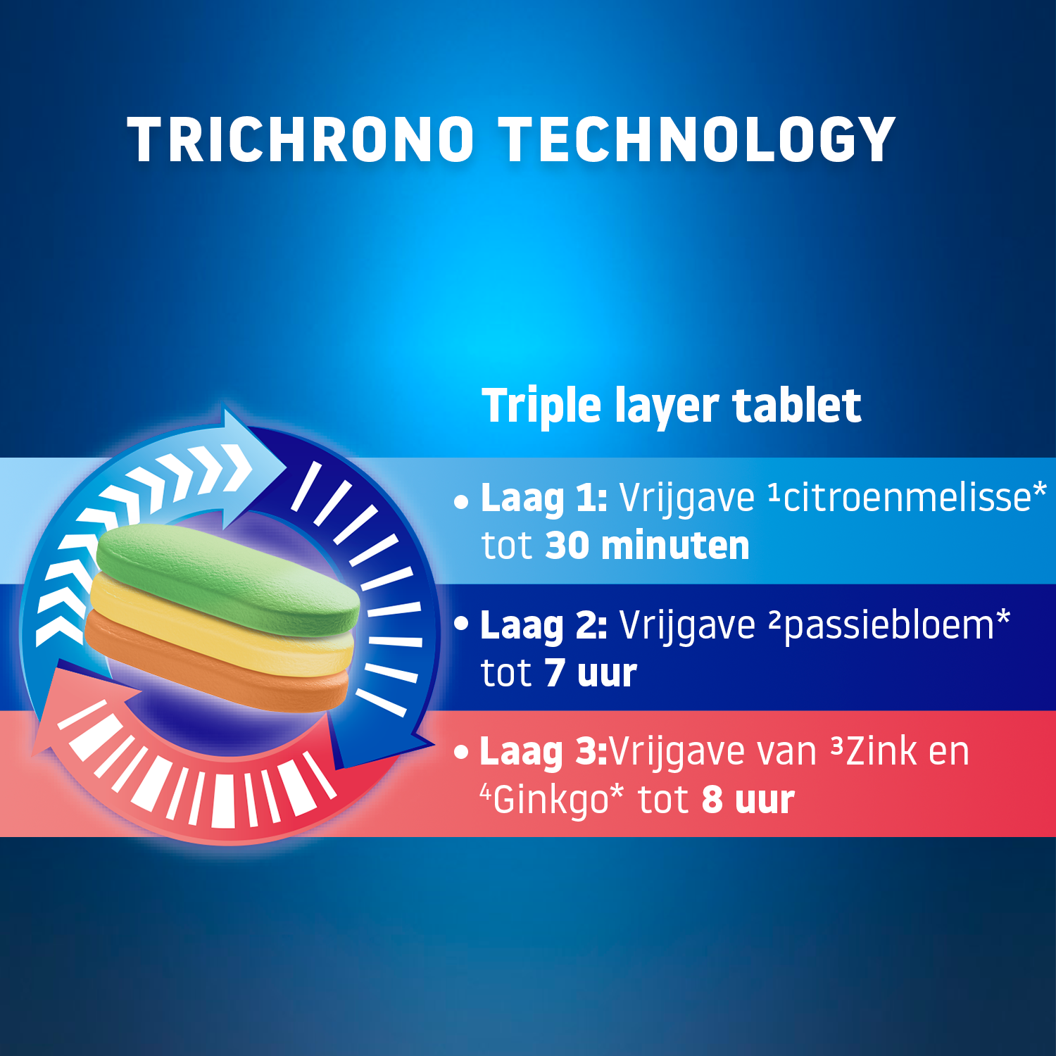 Het triple layer tablet met de TriChrono TM technology geeft de ingredienten in 3 fases gedurende de nacht af: