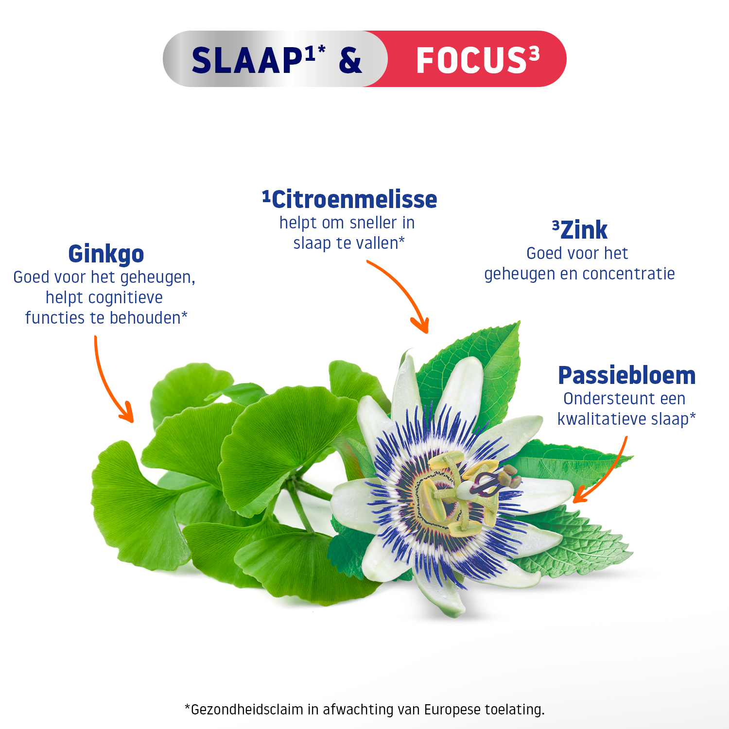 *Gezondheidsclaim in afwachting van Europese toelating. 1Citroenmelisse helpt om sneller in slaap te vallen*. 2Passiebloem ondersteunt een kwalitatieve slaap*. 4Ginkgo is goed voor het geheugen, helpt cognitieve functies te behouden. ³Zink is goed voor het geheugen en de concentratie.